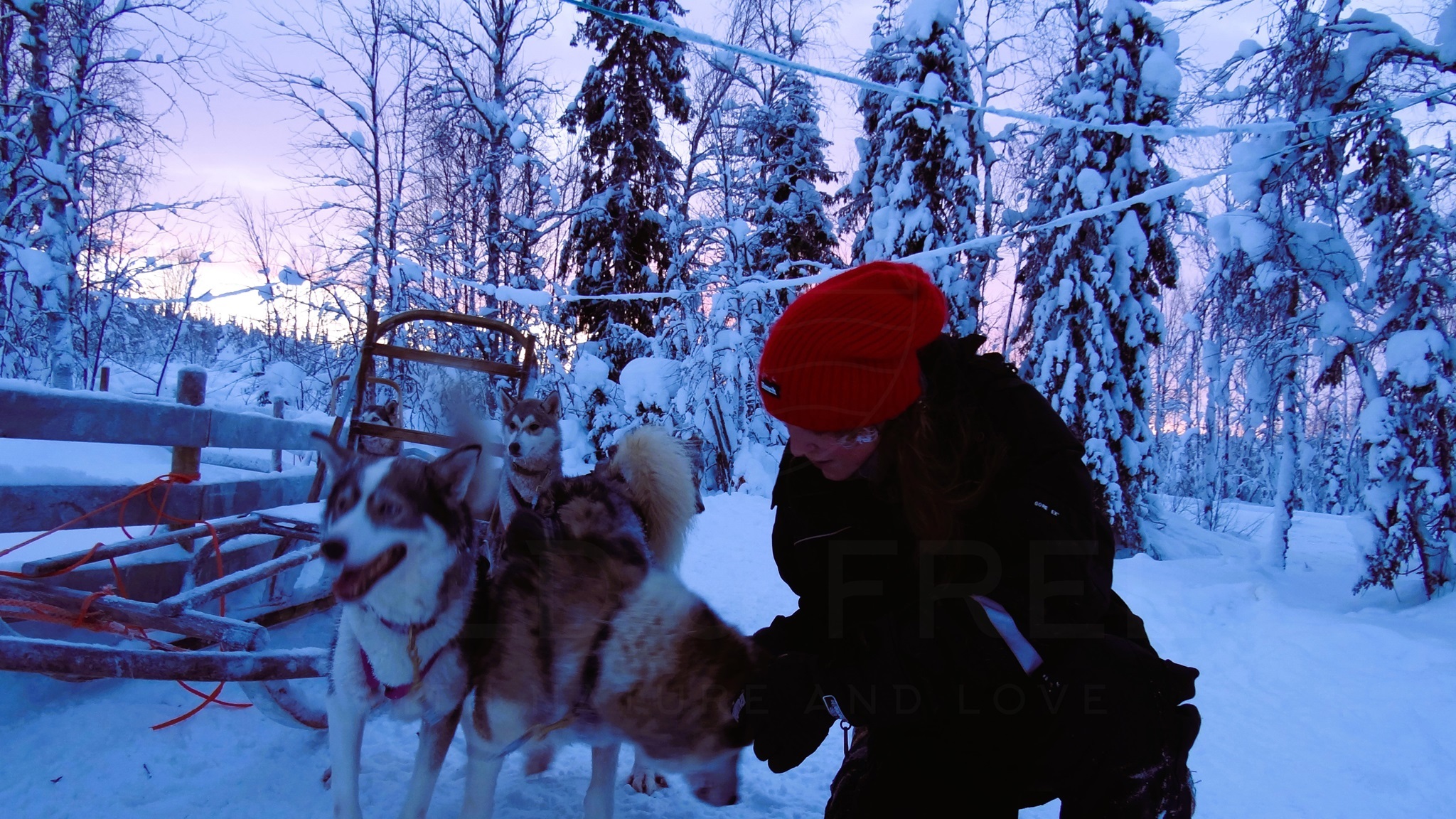 Sehr früh am Morgen fahre ich mit dem Auto zum vereinbarten Treffpunkt der Wild Motion Siberian Huskies, um mich mit einer kleinen Gruppe Mitbegeisterter zu treffen. Wir wollen gemeinsam mit Schlittenhunden den Sonnenaufgang beobachten und über einen Zeitraum von mehreren Stunden gemeinsam die wunderschöne Schneelandschaft bewundern. Schon bei der Anfahrt in der Morgendämmerung kann ich die vor Aufregung bellenden Huskies hören. Es ist Fütterungszeit und alle erwarten voller Begierde ihre Portion. Für die kommende Tour brauchen die Hunde ordentlich Energie. Mein Ziel des heutigen Tages ist es, den Schlitten mit den 6 Schlittenhunden alleine zu steuern, mit den Hunden zu kommunizieren und sie soweit es geht bei der Fahrt zu unterstützen.