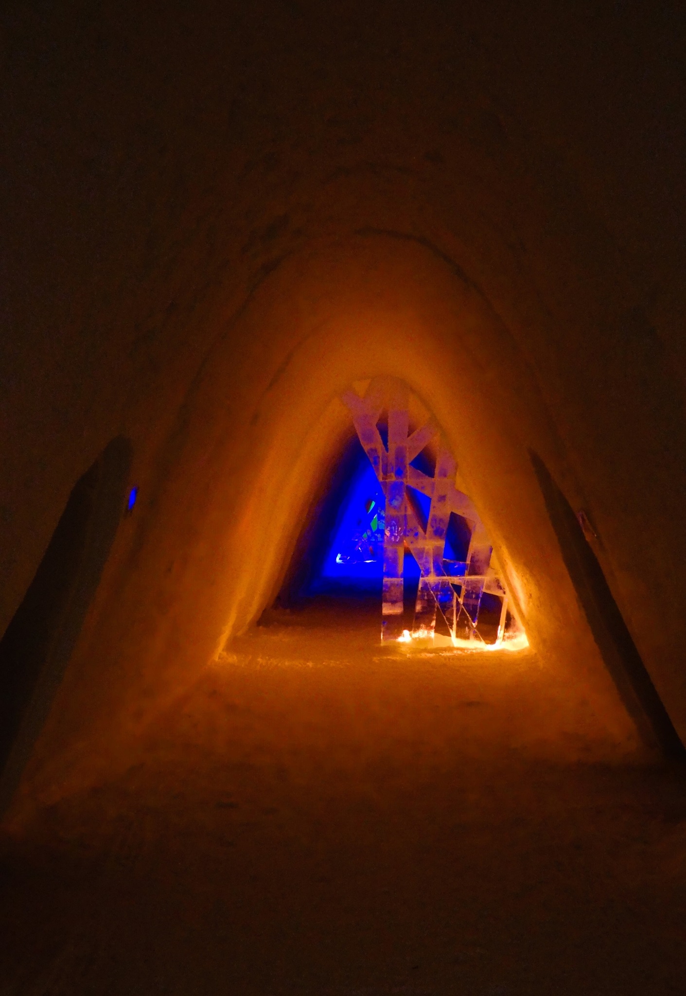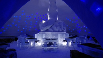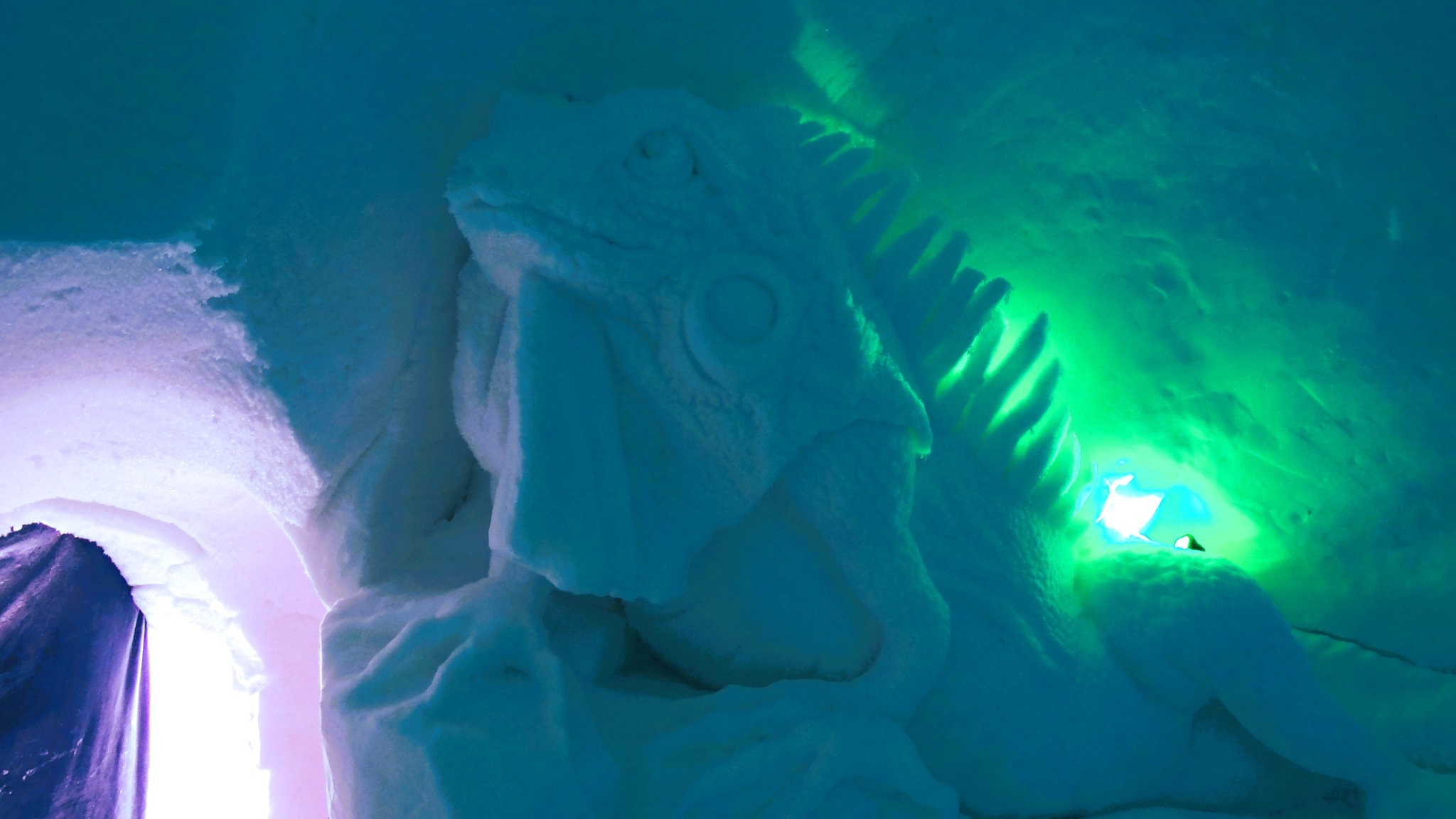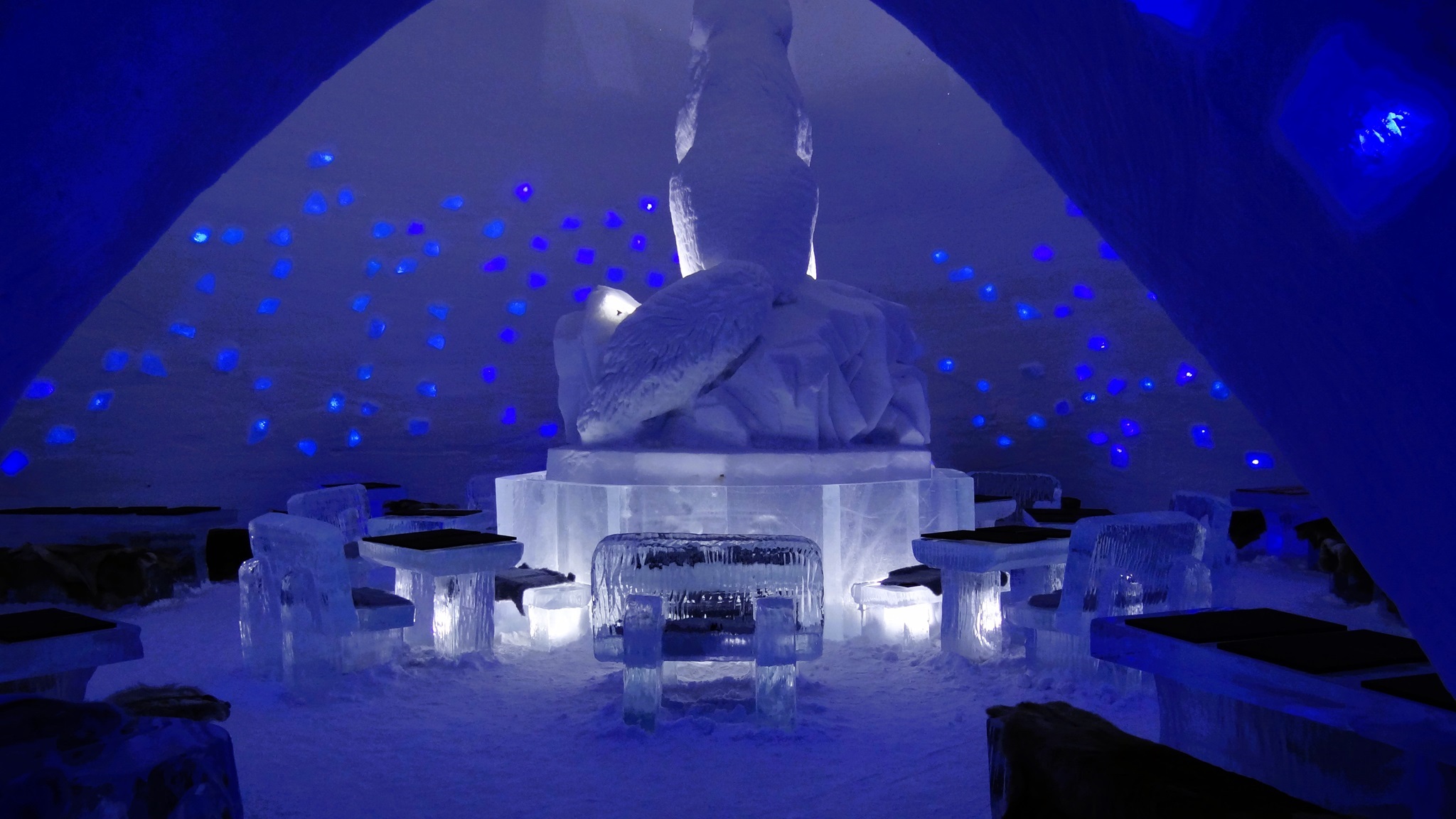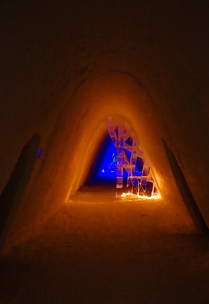 Eines unserer Ziele ist das Snowvillage Lainio, ein Hotel, das komplett aus Eis hergestellt wurde. Im Inneren des Gebäudes befinden sich viele Zimmer, in denen man übernachten kann, eine kleine Kapelle, eine Bar, ein Restaurant und vieles mehr. Sobald man das Innere dieses kleinen Wunders betreten hat, kommt man aus dem Staunen gar nicht mehr heraus. Wunderschöne kunstvoll in Eis geschnitzte Figuren und riesige Skulpturen schmücken jeden Raum und auch die schlauchartigen Gänge in dem Gebäude. Lichtinstallationen und auch Musik runden den Besuch in dieser kleinen "Eiswelt" ab.