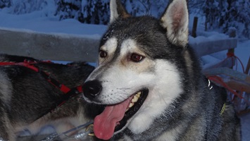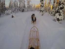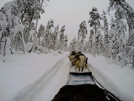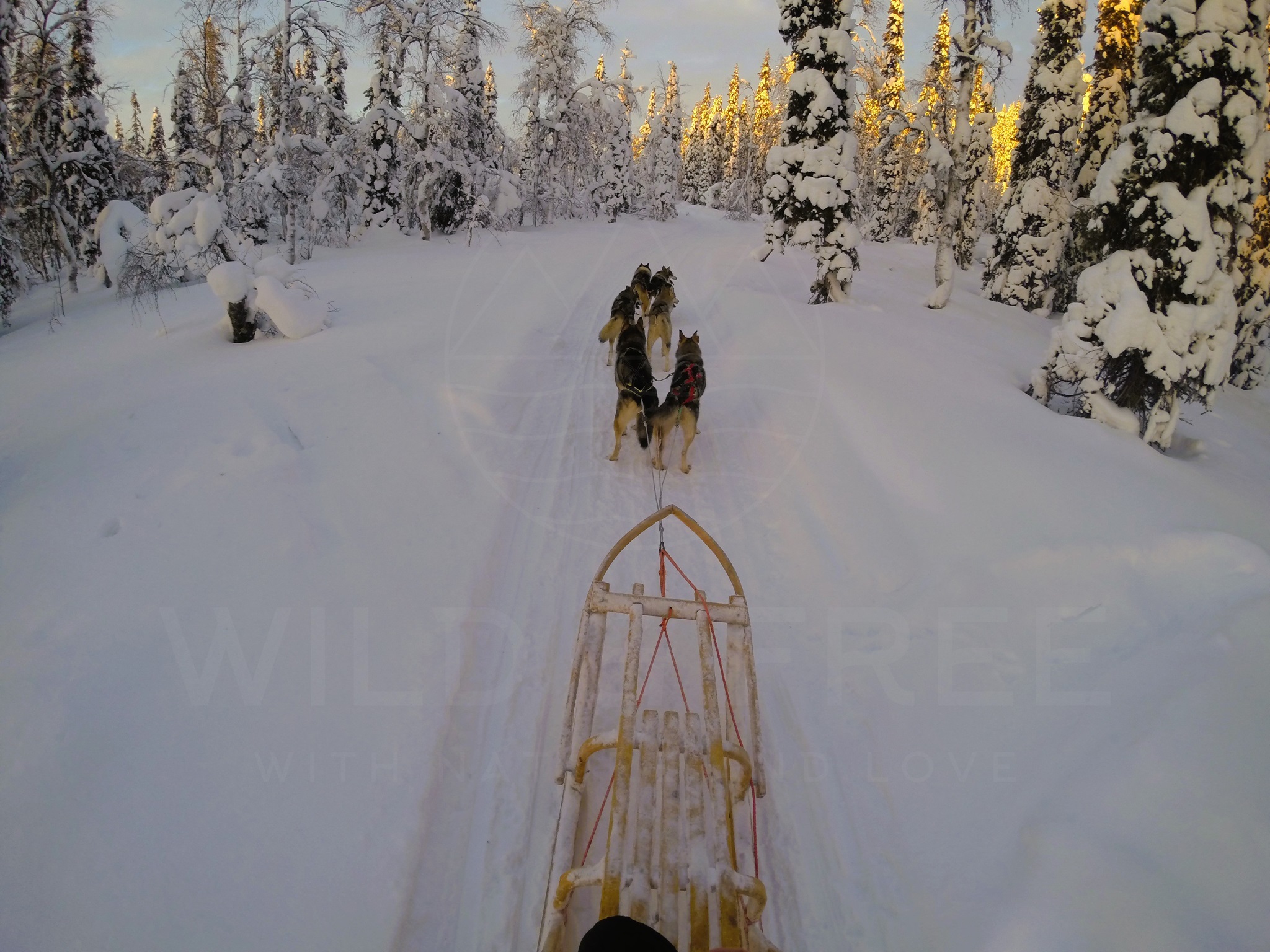 Die Fahrt durch einen lichten Nadelwald, über kleine Hügel und zugeschneite Seen ist einfach atemberaubend. Das einzige Geräusch, das ich während der Fahrt wahrnehmen kann ist das Hecheln der Hunde, die Kufen, die leise auf dem Schnee entlang gleiten und meinen Herzschlag, der sich nach Glück anhört.