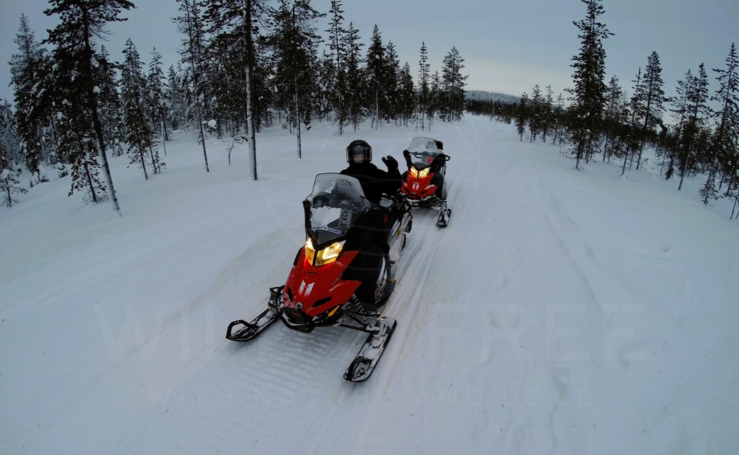 Nach einem erholsamen Tag, den ich mit Wanderungen verbracht habe, erwartet mich heute eine Tour mit dem Snowmobil. In einer kleinen Gruppe fahren wir gemeinsam durch die Schneelandschaft rund um Kittilä. Über verschneite Hügel, zugefrorene Seen und endlos wirkende weiße Straßen dürfen wir aus den Snowmobilen alles herausholen was geht. Das hier ist der komplette Gegensatz zu der idyllischen Ruhe und Ausgeglichenheit. Wer gerne einmal Gas geben uns sich auf den verschneiten Wegen austoben möchte, ist bei einer Tour mit Snowmobilen genau richtig. Auch viele Einheimische fahren hier anstelle des Autos mit dem Mobil herum, weil es leichter und flexibler zu fahren ist.